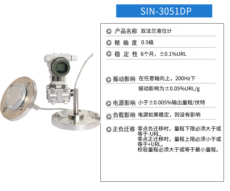 SIN-3051DP雙法蘭差壓液位變送器是一種為避免被測介質(zhì)直接作用于變送器的遠(yuǎn)傳隔離膜片接觸而采用的差壓式變送器(結(jié)構(gòu)測量法)。將變送器的測量膜片室用不銹鋼毛細(xì)管(直徑3mm左右的管子,外加保護(hù))連通道數(shù)米到數(shù)十米不等處的一個會兩個(壓力或差壓)做成法蘭形式的測量膜盒中,中間充滿傳到介質(zhì)(硅油),使用時將法蘭連接到設(shè)備,即可進(jìn)行測量。適用于需要將高溫介質(zhì)與變送器隔離;測量介質(zhì)對變送器敏感元件有腐蝕作用;被測介質(zhì)由于環(huán)境或溫度變化而固化或結(jié)晶;更換被測介質(zhì)需要嚴(yán)格凈化測量頭;懸浮液體或高粘度介質(zhì);測量頭要保持清潔衛(wèi)生;密封壓力容器測量。