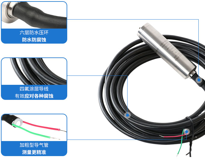 SIN-P260投入式液位變送器SIN-P260投入式液位變送器由高性能擴(kuò)散硅壓阻式壓力傳感器作為測(cè)量元件,把與液位深度成正比的液體靜壓力準(zhǔn)確測(cè)量出來,并經(jīng)過信號(hào)調(diào)理電路轉(zhuǎn)換成標(biāo)準(zhǔn)(電流或電壓)信號(hào)輸出,建立起輸出信號(hào)與液體深度的線性對(duì)應(yīng)關(guān)系,實(shí)現(xiàn)對(duì)液體深度的測(cè)量。產(chǎn)品精度高、體積小,直接投入液體中,即可測(cè)量出變送器末端到液面的液體高度,使用方便。適用于石油、化工、電廠、城市供水、水文勘探領(lǐng)域的液位測(cè)量與控制。經(jīng)過長期老化及穩(wěn)定性篩選,產(chǎn)品性能穩(wěn)定可靠,能夠適用應(yīng)用于環(huán)境比較惡劣的露天現(xiàn)場(chǎng),同時(shí)能夠現(xiàn)場(chǎng)液位顯示,零點(diǎn),滿程可遷移。